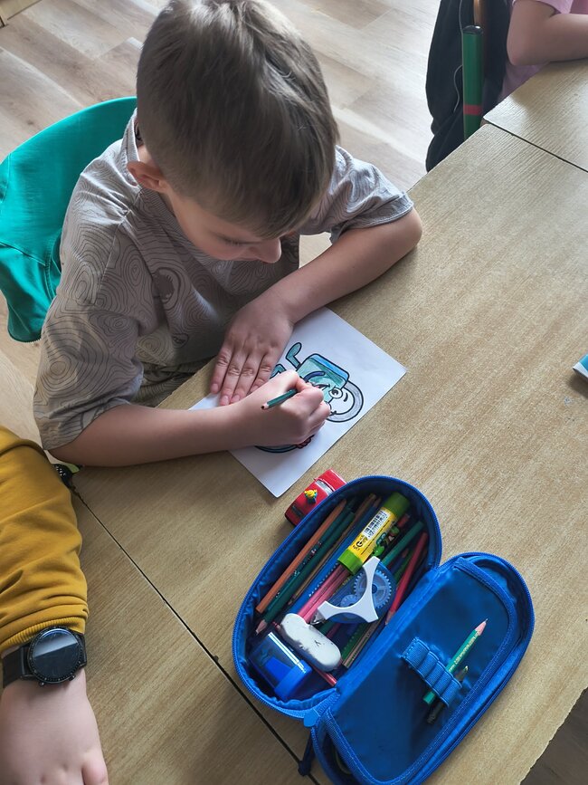 Nie zapomniano również o najmłodszych. Klasy 1–3 w ramach Dnia Bezpiecznego Internetu obejrzały film tematyczny dotyczący zagrożeń w sieci, przygotowany specjalnie z myślą o ich wieku i możliwościach percepcyjnych. Po projekcji uczniowie wykonali kolorowanki o tematyce bezpieczeństwa internetowego, co pozwoliło im utrwalić najważniejsze zasady w przystępny i atrakcyjny sposób.