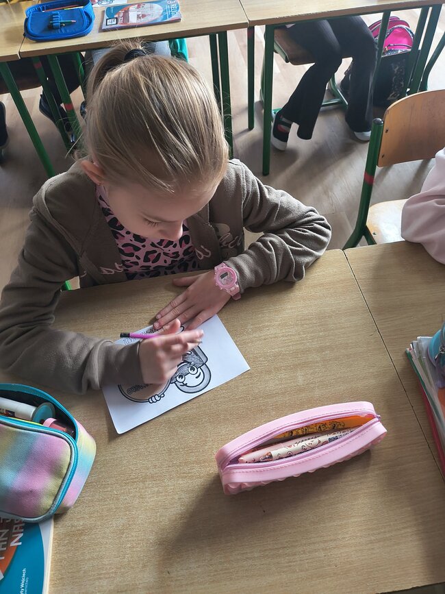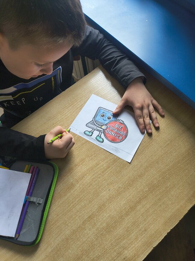 Nie zapomniano również o najmłodszych. Klasy 1–3 w ramach Dnia Bezpiecznego Internetu obejrzały film tematyczny dotyczący zagrożeń w sieci, przygotowany specjalnie z myślą o ich wieku i możliwościach percepcyjnych. Po projekcji uczniowie wykonali kolorowanki o tematyce bezpieczeństwa internetowego, co pozwoliło im utrwalić najważniejsze zasady w przystępny i atrakcyjny sposób.