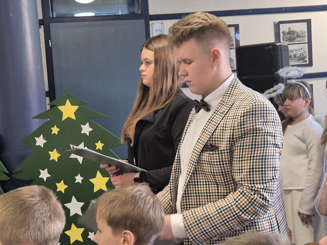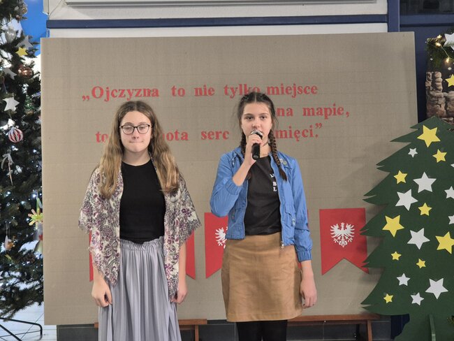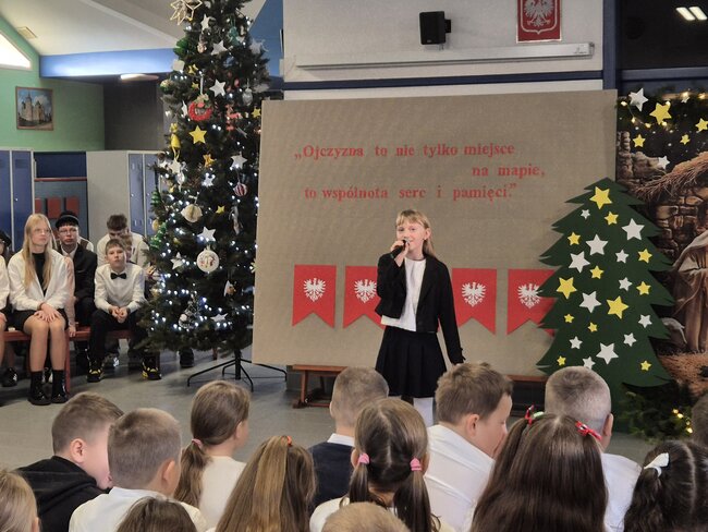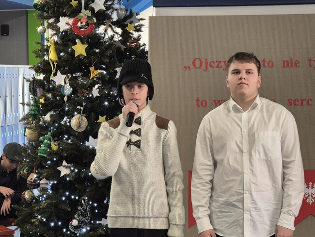 Ostatni dzień przed świętami był w naszej szkole szczególnie uroczysty. Już od rana na uczniów klas 4-8 czekały świąteczne zadania. Po ich wykonaniu spotkaliśmy się przy wigilijnym stole, składając sobie życzenia. Ostatnim, najważniejszym punktem były obchody Dnia Patrona Szkoły. Uroczysta akademia, w klimacie patriotyczno-bożonarodzeniowym, zabrała nas w podróż przez 2000 lat historii.