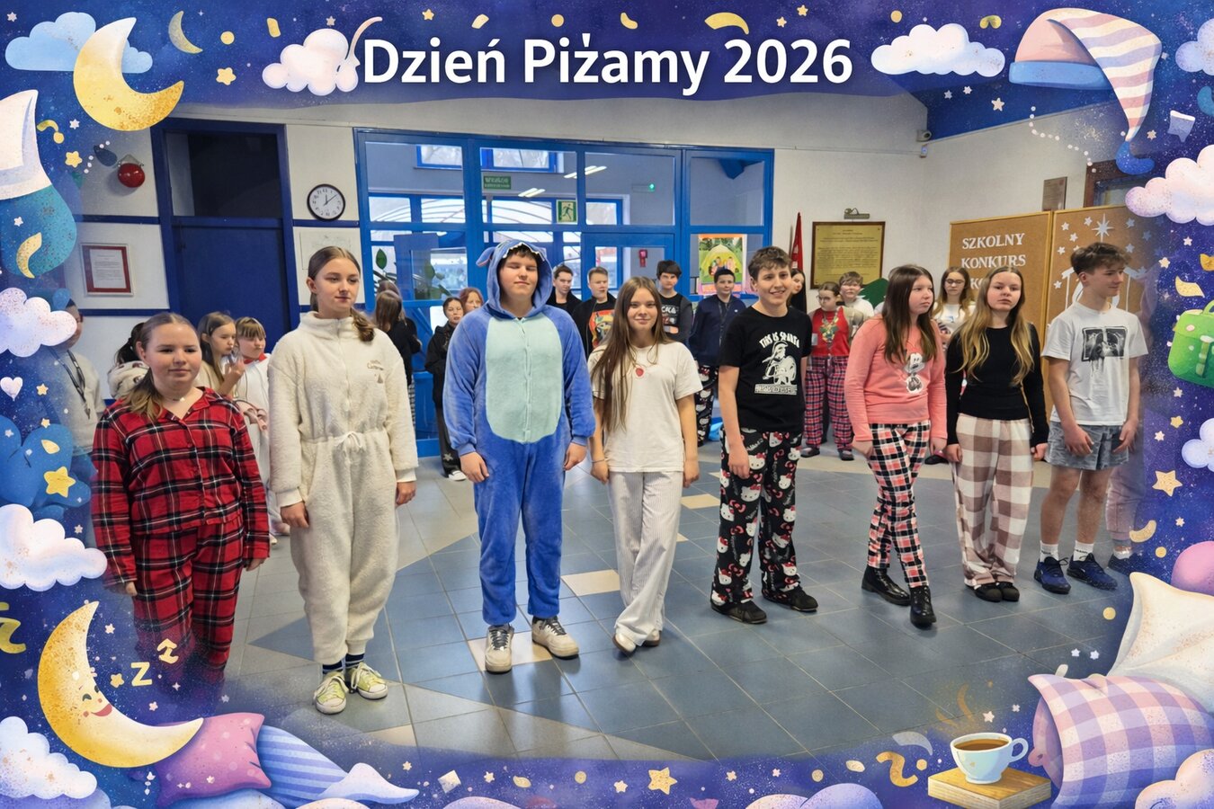 Dnia 30 stycznia 2026r. w naszej szkole obchodziliśmy „Dzień piżamy”.Uczniowie klas IV-VIII tego dnia przybyli do szkoły ubrani w kostiumy, w których zwykle kładą się do snu. Różnorodność strojów robiła ogromne wrażenie. Podczas dużej przerwy odbył się klasowy konkurs na najbardziej interesujący i zabawny outfit. Zwycięzcy otrzymali drobne upominki, a wszyscy, którzy tego dnia przybyli do szkoły w piżamie,byli tego dnia zwolnieni z odpytywania na wszystkich lekcjach.