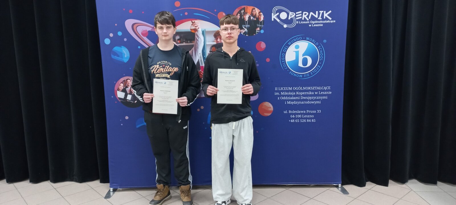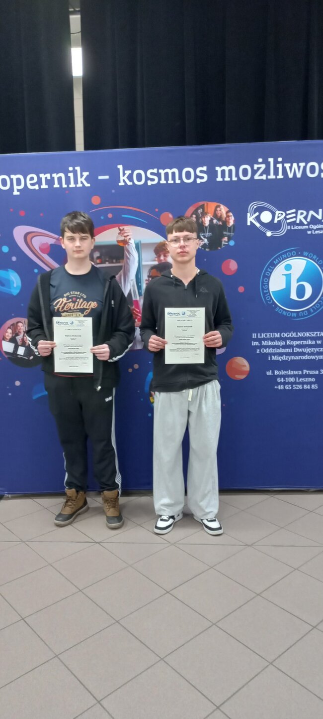W dniu 9 marca odbył się finał XIII Regionalnego Konkursu Języka Angielskiego ,,Junior English Combat’’ w II Liceum Ogólnokształcącym im. Mikołaja Kopernika w Lesznie. Naszą szkołę reprezentowało dwóch uczniów klasy 8 Szymon Dudkowski i Szymon Ratajczak, którzy uzyskali najwięcej punktów podczas etapu szkolnego. Uczniowie musieli wykazać się wiedzą z zakresu słownictwa, gramatyki, umiejętnością czytania ze zrozumieniem oraz znajomością historii, geografii, kultury angielskiego obszaru językowego. Szymon oraz Szymon uzyskali wysokie wyniki podczas finału konkursu i otrzymali zaświadczenia zwalniające ze sprawdzianu kompetencji językowych w czasie rekrutacji do klas dwujęzycznych i przygotowujących do Matury Międzynarodowej w II LO. Gratulacje!